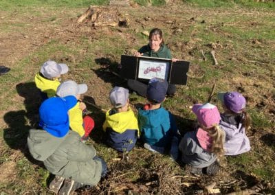 Wir starten mit einem gemeinsamen Impuls in den Tag. Hierbei kommen lustige Spiele, Sinnesübungen oder Rätsel zum Einsatz, die uns auf die Zeit im Wald einstimmen. Im Anschluss gehen die SuS in Kleingruppen in spannende Workshops. Im Workshop „Wald und Holz“ lernen die SuS den Nutzen des Waldes als Holzlieferant kennen und arbeiten mit dem Werkstoff Holz. Bei der Erforschung des Waldbodens entdecken sie Bodenlebewesen und deren Funktion im Ökosystem. Im Workshop „Wald und Tiere“ lernen die SuS die Tiere des Waldes kennen und begeben sich auf Spurensuche. Auch die Kreativität kommt nicht zu kurz, wenn die SuS Kunstwerke mit Naturmaterialien gestalten. Weitere Themenfelder sind je nach Gruppengröße möglich. Am Ende des Projekttages treffen wir uns wieder in der Großgruppe um unsere Erlebnisse auszutauschen.